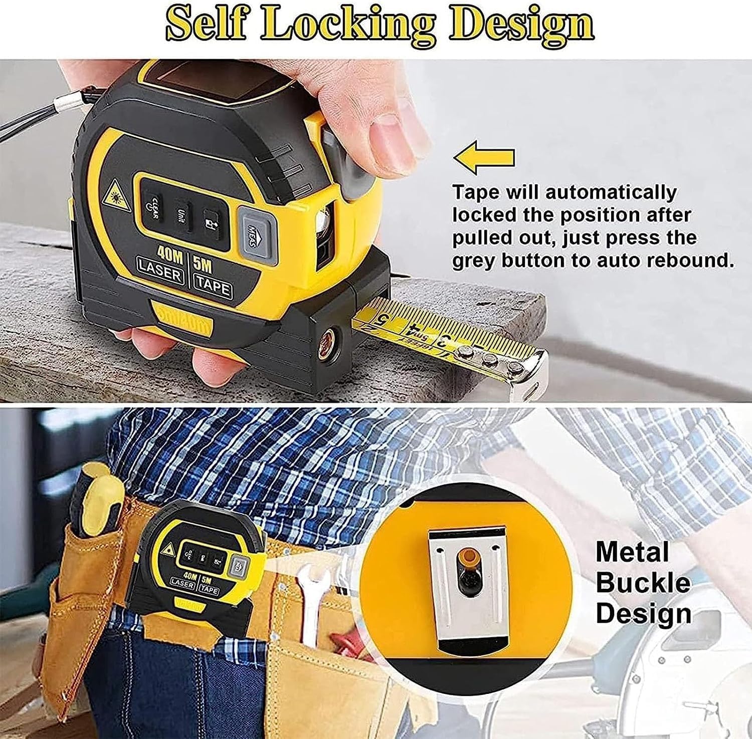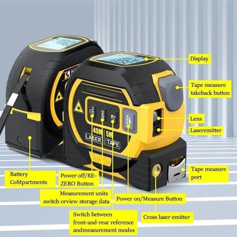 🔹 3-in-1 Versatility – Combines Laser Rangefinder (131ft/40M), 16ft/5M retractable steel tape, and Cross-Line Laser Level for maximum flexibility.